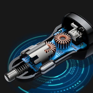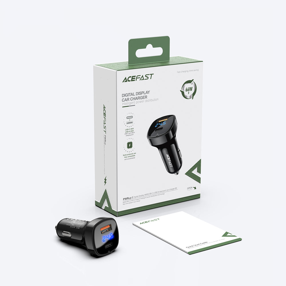 Acefast fast car charger. It has 2 ports, USB Type C and USB. The first USB Type C plug allows you to charge with a maximum power of 36W, and a USB plug up to 30W. Allows for quick charging, among others in PPS, Power Delivery, Quick Charge 3.0, AFC and FCP standards. 2 devices can be connected to it at the same time. It is made of fireproof PC material. It has been equipped with many protections, such as overheating, overvoltage, high voltage or overload.