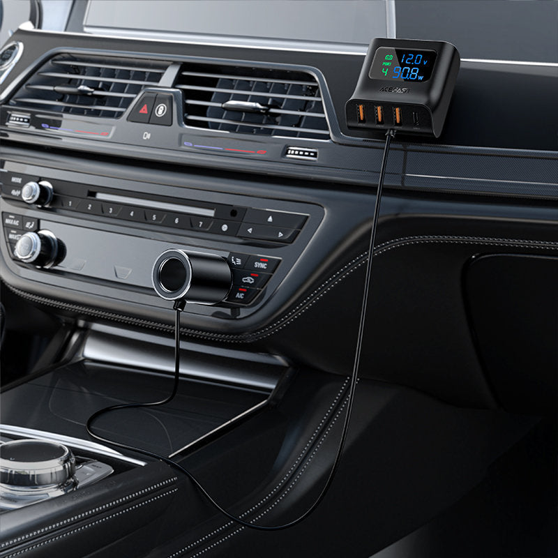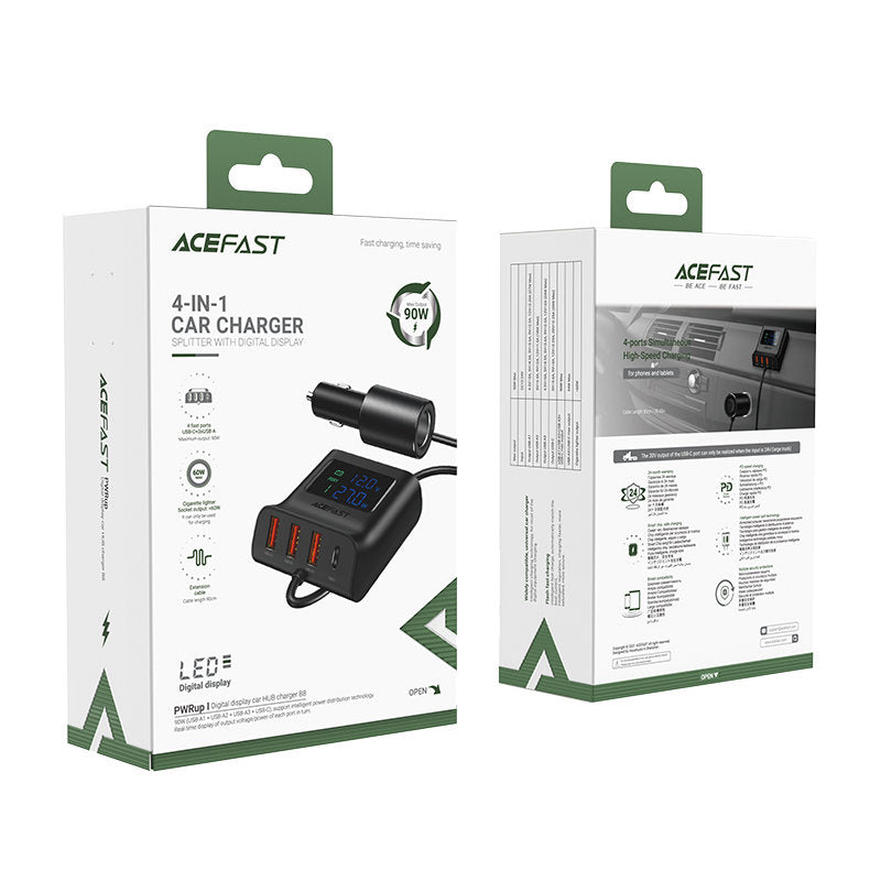 Acefast car charger with an additional cigarette lighter connector and charging meter. It has an additional cigarette lighter connector, 3 USB connectors and 1 USB Type C connector. It supports 90W power for distribution to all USB connectors. The built-in meter allows you to check the current value with which the charger is currently working. The charger consists of a plug with a cigarette lighter adapter and a base with built-in connectors. Both parts are connected by a 90 cm cable. Allows for quick charging, among others in PPS, Power Delivery, Quick Charge 3.0, AFC and FCP standards. 4 devices can be connected to it at the same time. It is made of fireproof PC material. It has been equipped with many protections, such as overheating, overvoltage, high voltage or overload.
