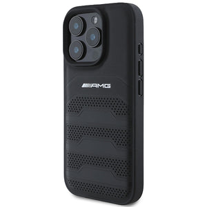 AMG odinis iPhone 16 Pro Max dėklas su įspaustomis linijomis ir juodu logotipu – juodas