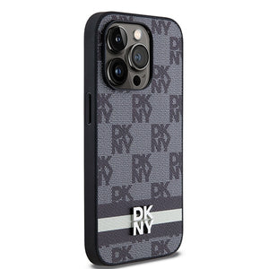 DKNY Leather Checkered Mono Pattern & Printed Stripes iPhone 14 Pro Case - Black