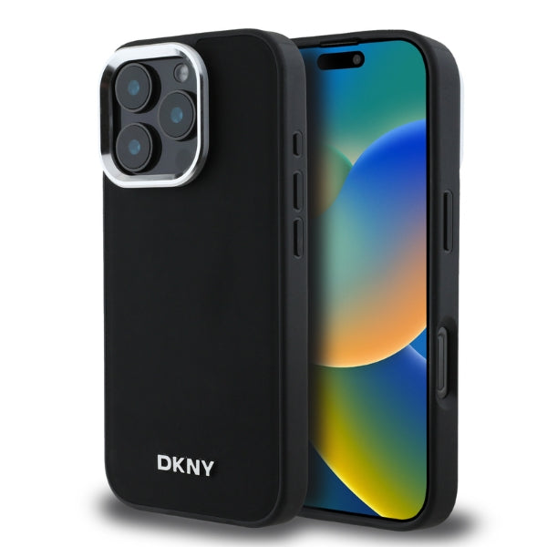 Minimalistinio dizaino su dekoratyviniu sidabriniu DKNY logotipu dėklas taip pat turi blizgantį kontūrą aplink kamerą, kuris papildomai ją apsaugo.