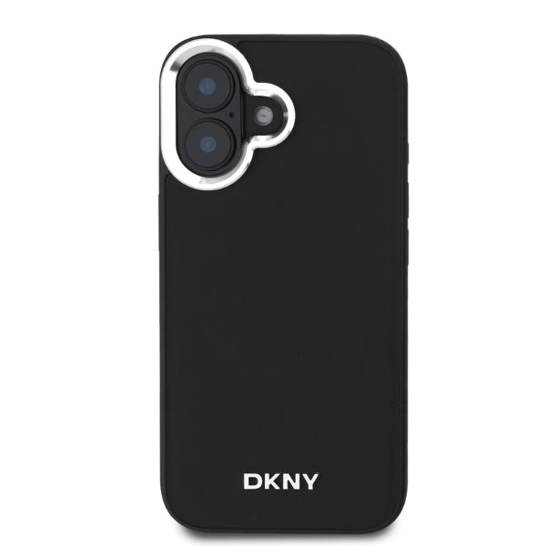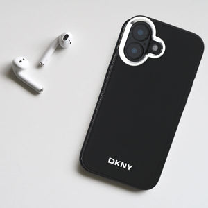 Minimalistinio dizaino su dekoratyviniu sidabriniu DKNY logotipu dėklas taip pat turi blizgantį kontūrą aplink kamerą, kuris papildomai ją apsaugo.