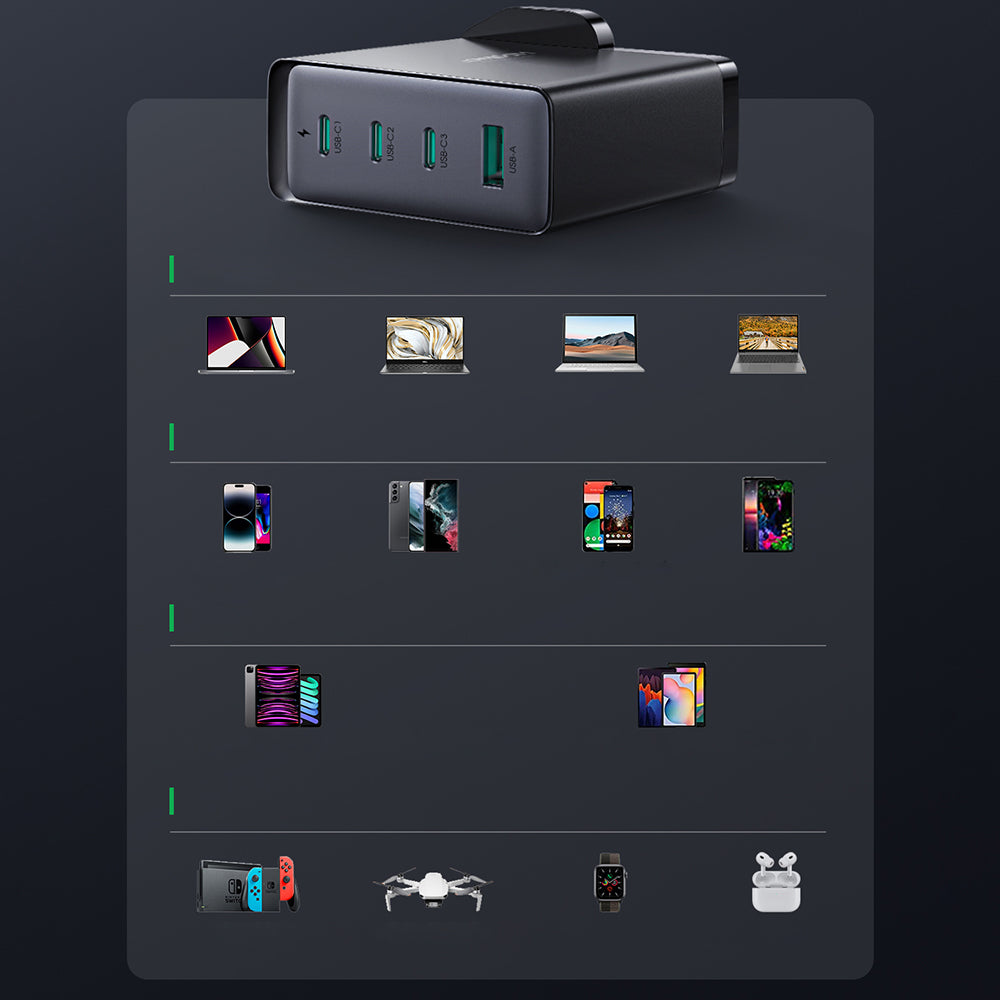 - It can charge multiple devices simultaneously . Equipped with 3 USB-C ports and 1 USB-A port, it allows you to charge 4 devices at the same time.