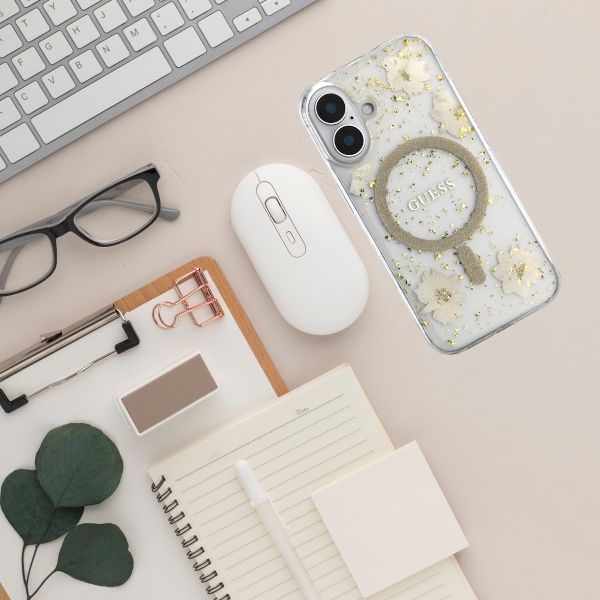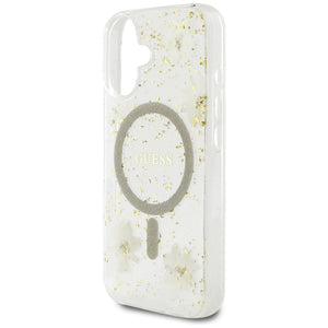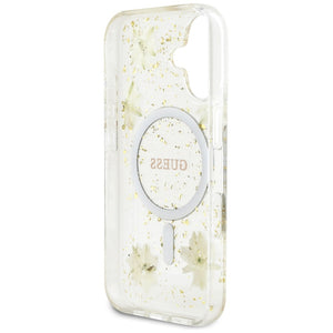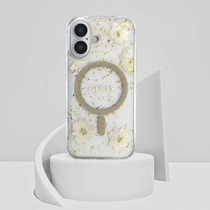 „Guess“ blizgučiais puoštas „MagSafe iPhone 16“ dėklas su dervos gėlėmis – smėlio spalvos