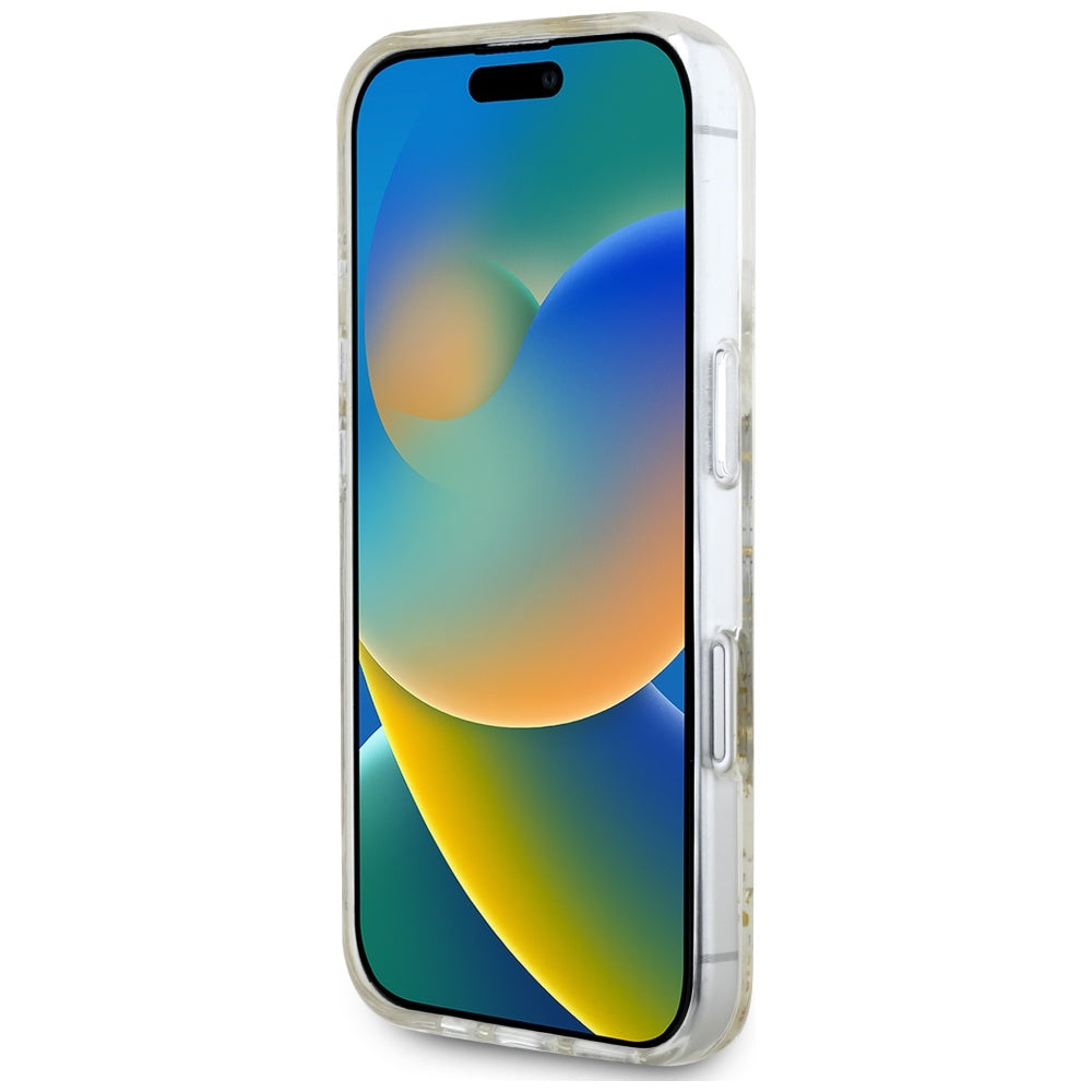 Centrinėje dėklo dalyje yra „Guess“ logotipas ir blizgantis „MagSafe“ žiedas, kurie subtiliai pabrėžia šio dėklo prestižą.