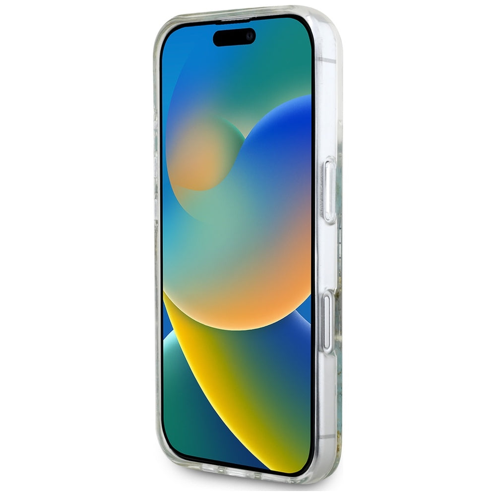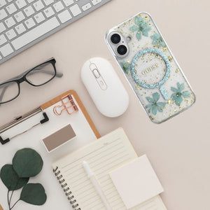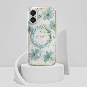 „Guess“ blizgučiais puoštas „MagSafe iPhone 16“ dėklas su dervos gėlėmis – skaidriai žalias