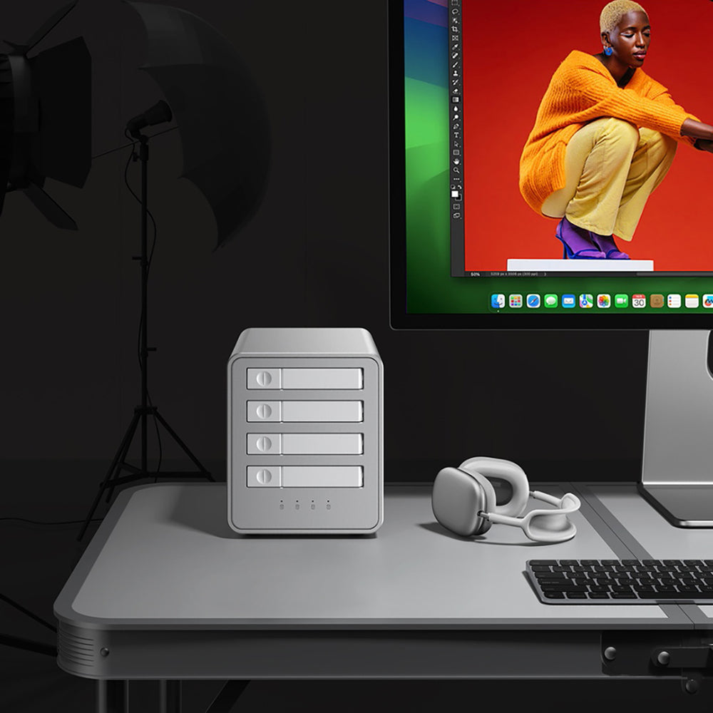 The Orico 8848U4 is an advanced all-flash DAS array designed to work with four M.2 NVMe SSDs. It offers high throughput of up to 40 Gbps and capacity of up to 32 TB, enabling the efficient handling of large projects and intensive data work. Its compact, lightweight design simplifies workspace organization, and the aluminum casing supports efficient heat dissipation. Software RAID support allows for flexible data management depending on the work scenario. This solution is designed with stability, performance, and data organization in mind.