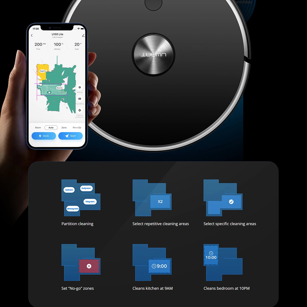 UWANT U100 Lite is equipped with advanced LDS technology, which allows precise room mapping and efficient movement on different surfaces. The robot easily copes with obstacles, and its ability to create maps makes its work very efficient, even in complicated spaces.