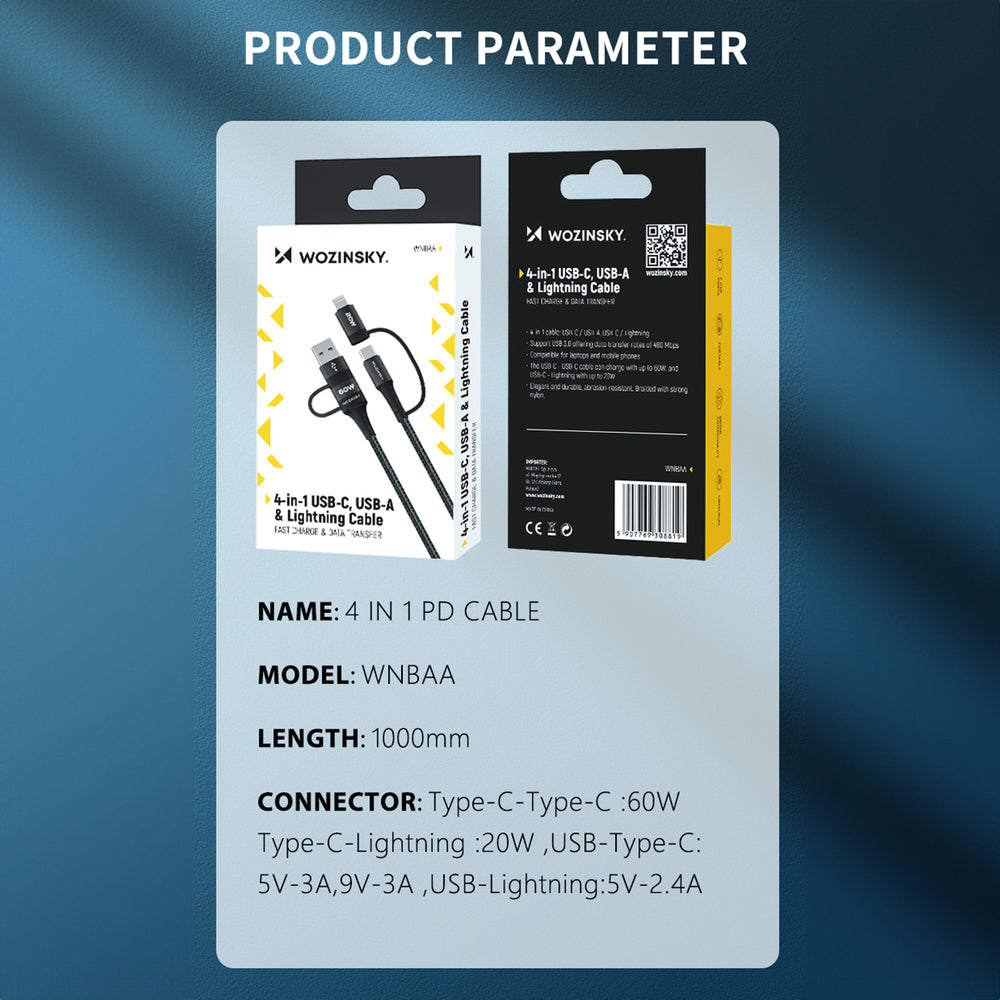 Made of high-quality materials, the Wozinsky WNBAA 4in1 cable is resistant to abrasion and corrosion, which ensures its durability. The elegant black braid not only protects the cable from damage, but also adds style and elegance.