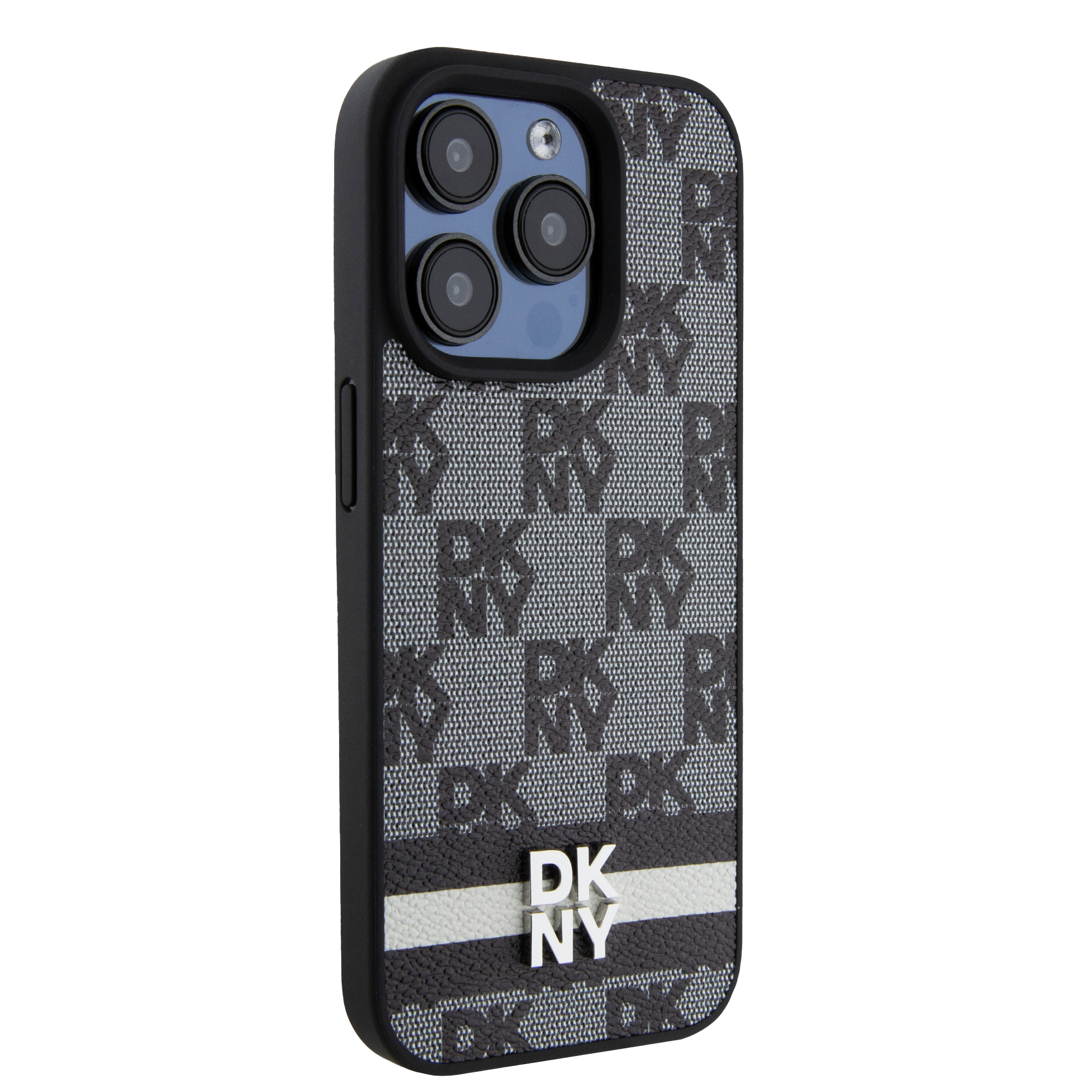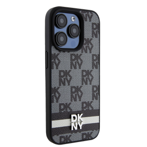 DKNY Leather Checkered Mono Pattern & Printed Stripes iPhone 15 Pro Case - Black