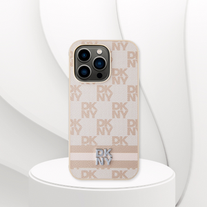 Each case is decorated with a unique motif of the initials of the exclusive DKNY fashion house, which form an unusual check pattern. This pattern is very characteristic and attracts attention thanks to its unique design. An additional decoration is wide stripes in the color of the cover, which achieves harmony and elegance. The whole is topped with a metal DKNY brand logo, which emphasizes the prestige and authenticity of the collection.