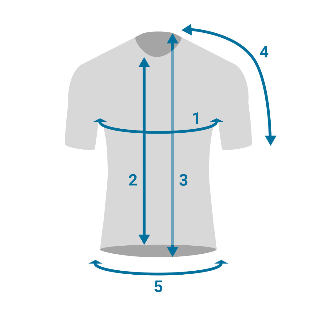 | Size | 1) Bust circumference (cm) | 2) Front length (cm) | 3) Back length (cm) | 4) Sleeve length (cm) | 5) Hip circumference (cm) | Approximate height (cm) | Approximate weight (kg) |